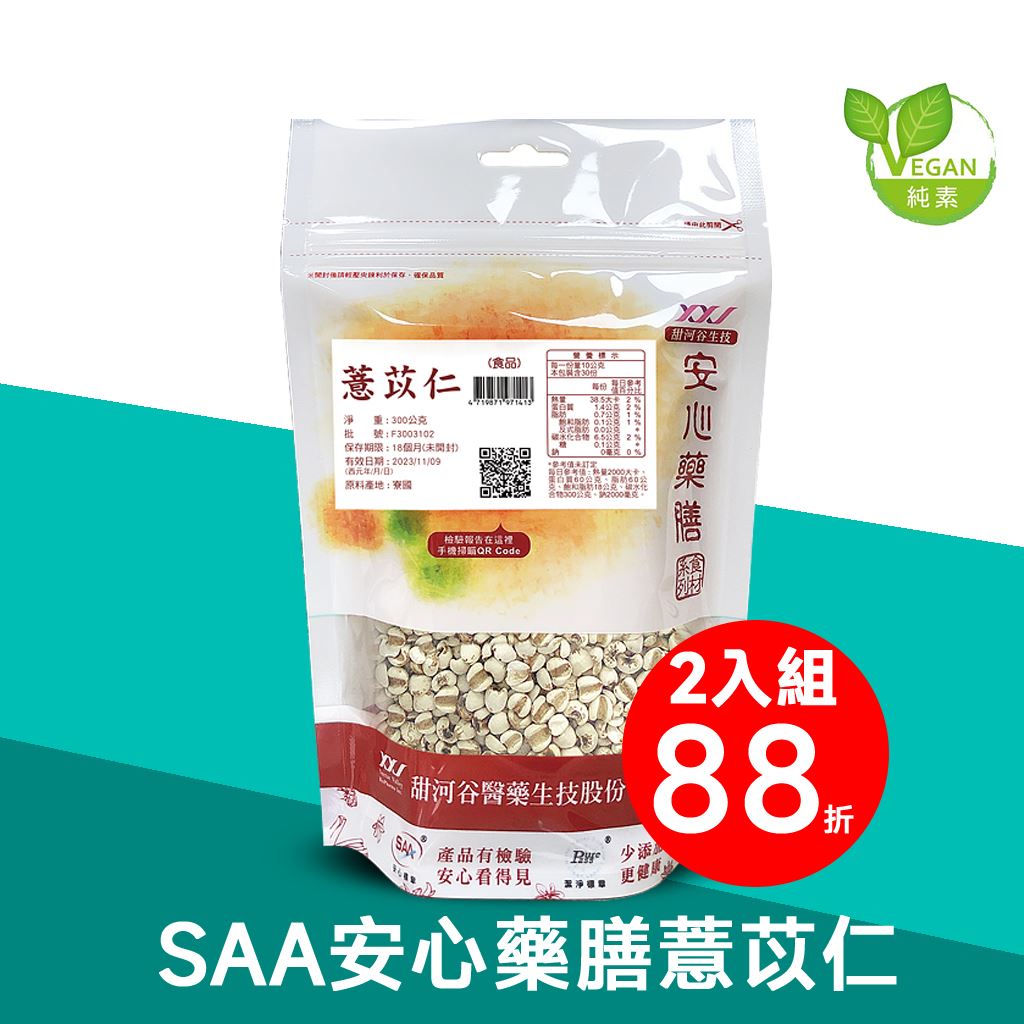 Ans : ❶ SAA安心藥膳薏苡仁每一批需依據台灣中藥典 (Taiwan Herbal Pharmacopeia,THP) 進行每一項檢驗標準。 ❷ 由G.M.P中藥廠嚴謹把關與基源品種鑑定。 ❸ 每一批皆通過農藥殘留、二氧化硫、黃麴毒素、重金屬檢驗。 ❹ 檢驗報告以手機掃瞄包裝QR code即可一目了然。